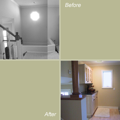 This 1970’s house was in need of an updated look. A dark corner with a “pit” meant to be filled with lava rock was a prominent feature in the living room. This awkward space that had been ignored at best and ugly at worst became a cheery asset for the living room that augments the owner’s lifestyle of frequent entertaining.