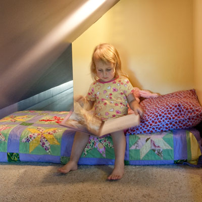 The sleeping side of the room is scaled just perfectly to the little girl who lives here. As she grows too big to sleep in this child-scaled room, she can use it instead as a place to snuggle up and read a book, or just have a quiet moment away from her brothers.