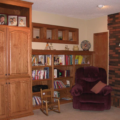 The lower datum line established by the bookshelf creates a cozy, smaller scaled corner within this large family gathering space. The design of the cabinets also incorporates four little windows (one for each of their children) that connect to the south-facing dining room. Having light coming in from two sides makes the whole room feel more open and also provides an interesting visual connection to another part of the house, making the "cave" description obsolete.
