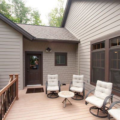 Looking back toward the house, while on the deck, shows how the scale of the mudroom link and the tiny window in the powder room helps to create a well-proportioned "room" for the people out on the deck.