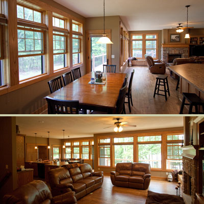 The living room, dining room, and kitchen all flow together as one continuous space, yet careful attention to the definition of the edges still allows each to maintain its own identity.
