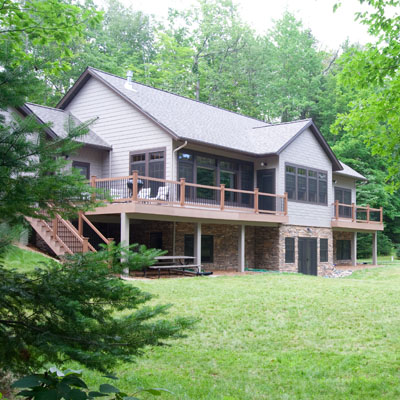 Even from the lakeside where the walk-out lower level is visible, this house sits sturdily without feeling overpowering. The stone base helps it to feel as though it grows out of the ground instead of being set upon the ground, and the grade gently wraps up the sides to hold it securely.