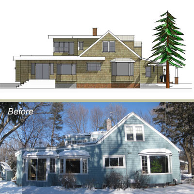 We employed a few strategies to unify the exterior. The first was simply to unify the use of cladding. The three existing bay windows on the side of the house were all clad with a contrasting siding. Although we often use an accent siding (including on this project!), there were too many of these little "bumps" that truly did not need to be accentuated. The "core" of the house now reads more as one unit, allowing us to use a different cladding material at the edges.