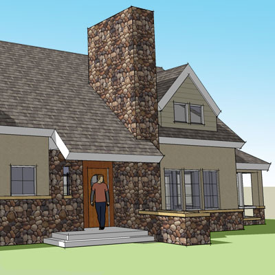 Having lived for a time in England, they wanted a stylistic nod to the English "cottage", as well as space for a small pub, a library, and a smoking porch, all within quite a tight target square footage. It was exciting to work with them to define the important pieces of what it meant to be a "cottage" — in this case, using materials from the site (the fieldstone), having low eaves and thick walls, and using rough-cut timbers to define the ceiling planes of the interior spaces became key driving forces behind the design.