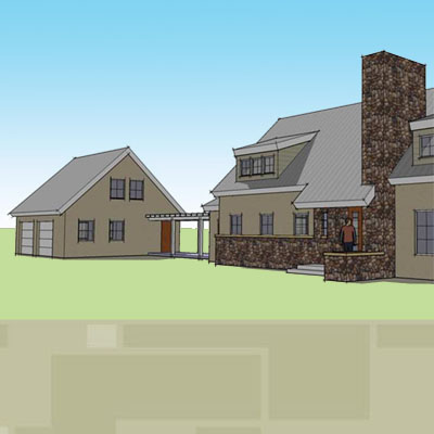 This version of the schematic design model shows shed dormers instead of the gable dormers shown in previous images. We also modeled here what the house would look like with the stone only wrapping around the east side as a cost-saving option. The latter part of the schematic design or early design development phase is the perfect time to explore the impact of these sorts of subtle changes.