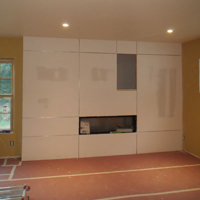 That fireplace design is developing! We now have the unit installed - somewhat of a different direction than what we'd originally been planning in the earlier study models, but still using the same concept of assymetrical rectangles and lines (control joints) integrating the fireplace (mostly installed - just waiting for the finish frame), the bookshelf (still just an open hole), and eventually the mantle (even with the bottom of the bookshelf), and the bench (wrapping along the lower control joint from the seats under the windows to the left.)