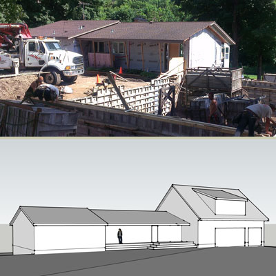 The original house can be seen in the image above, taken during the construction. A very small 2-car garage was removed from the right side of the house. Before talking with us, the owners had been envisioning reclaiming the space of the existing garage for part of a new family room, but when we helped them look at what the desired end result of the project was to be, it became clear that any percieved cost savings by not tearing the garage off were far outweighed by the long-term benefits of the spatial arrangements gained by designing that junction to be just what we wanted it to be.
