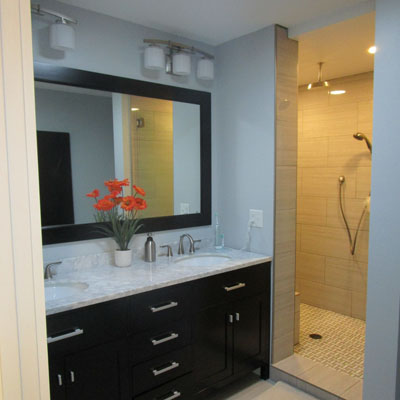 One detail of the project that was particularly delightful to the owners was the creation of their own private bathroom. There was just enough interior space to carve out room for a large vanity and a generous double shower. The addition of a solotube (a reflective, lined tube from a roof-mounted dome to a fixture in the ceiling) in the bathroom means that even though the room is entirely internal and so has no windows, there is ample light to see during the day even without the light on.