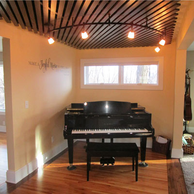 The decorative slatted wood ceiling treatment was designed to not only add a beautiful element to the entry/piano room, but also provides a place to conceal acoustic panels to help control the sound created in this space.