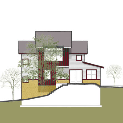 An entry for the 2004 St Paul Prize Design Competition -- one of eight finalists. The exterior appearance of this house is inspired by the older homes in the surrounding neighborhood, but is reinterpreted in a way that puts it in the context of the present instead of just duplicating the past.